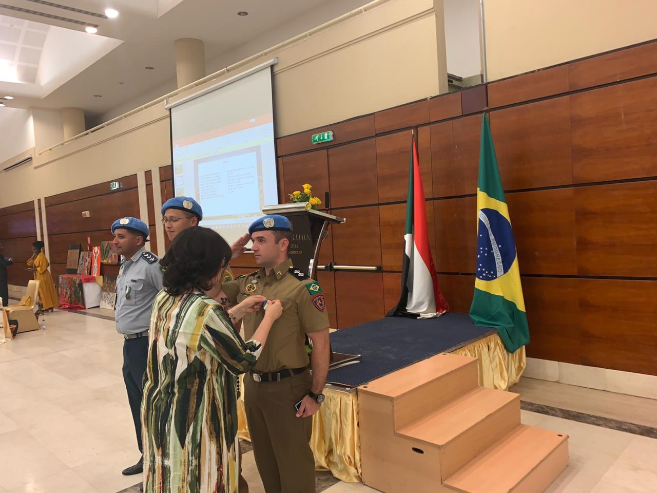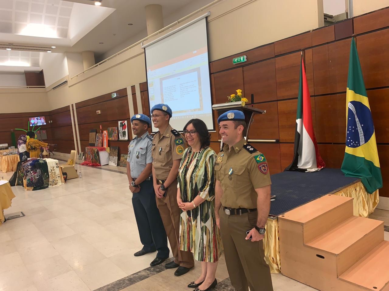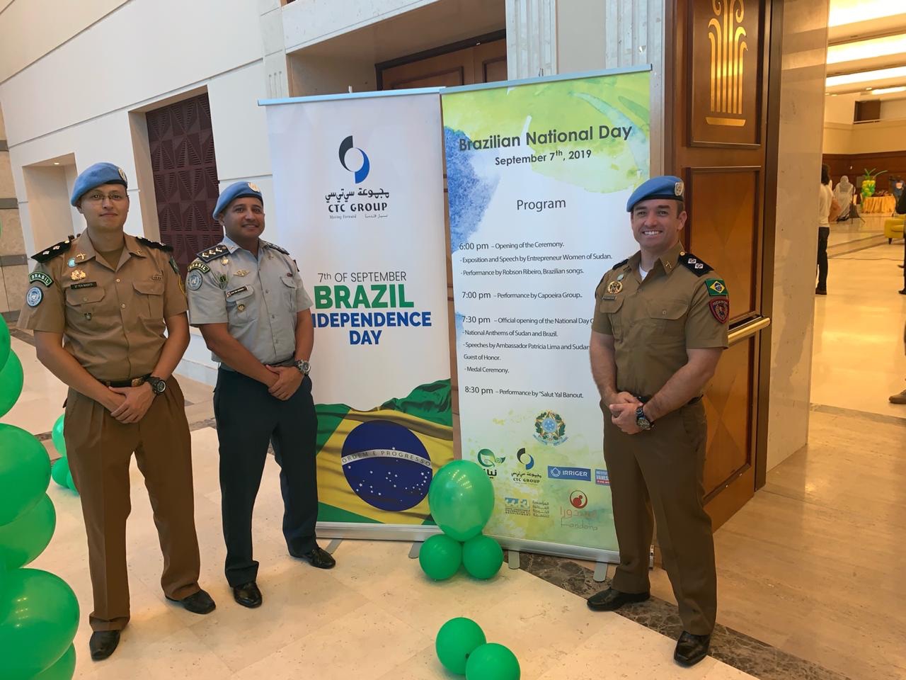 Os primeiros 4 policiais militares a servir na Missão de Paz Híbrida da ONU/União Africana em Darfur (UNAMID) continuam a manter uma excelente relação com a representação diplomática do Brasil no Sudão e foram convidados a participar da comemoração referente ao dia 7 de setembro, Dia da Independência do nosso país, promovida em Cartum pela Embaixada do Brasil no Sudão. A solenidade ocorreu no Conthian Hotel.
