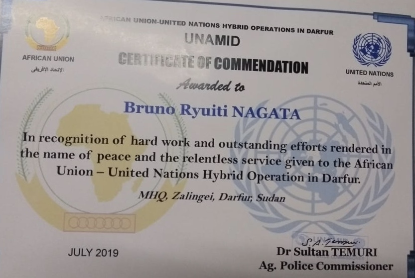 O Tentente Bruno Nagata, da Polícia Militar do Paraná – PMPR, foi escolhido o “Policial Destaque do mês” na Missão Híbrida ONU/AU No Sudão (UNAMID), com outstanding performance. Também recebeu uma Carta de recomendação do Police Commissioner, o chefe do componente policial da ONU no Sudão.